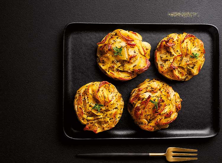 Déposez les effeuillés de pommes de terre encore surgelés sur une plaque recouverte d’un papier cuisson. Enfournez à mi-hauteur et laissez réchauffer 25 à 30 minutes à 180°C (Th 6) (30 à 35 minutes dans un four traditionnel). Déposez délicatement les effeuillés de pommes de terre à l'aide d'une spatule.