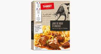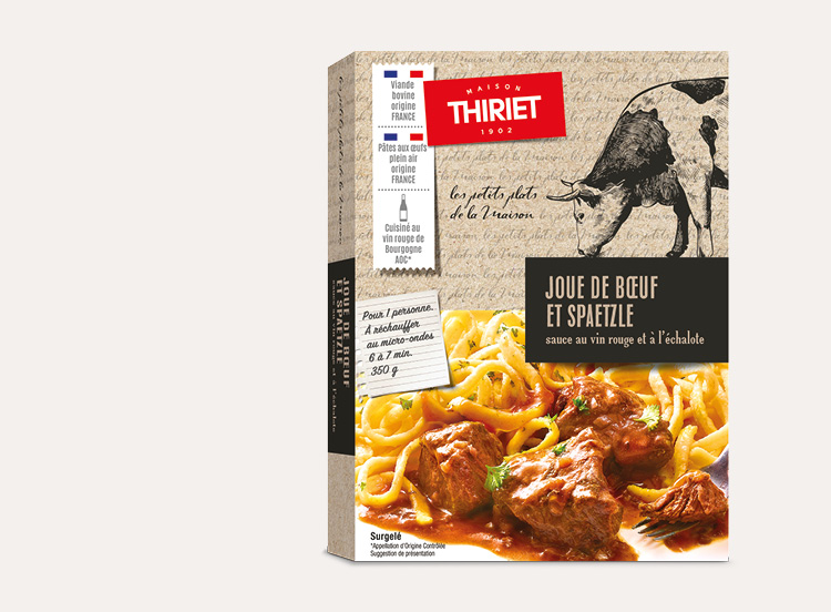 Dénomination de vente : Produit surgelé. Spaetzles et sauté de joue de boeuf nappé de sauce 34.2% au vin rouge et à l'échalote